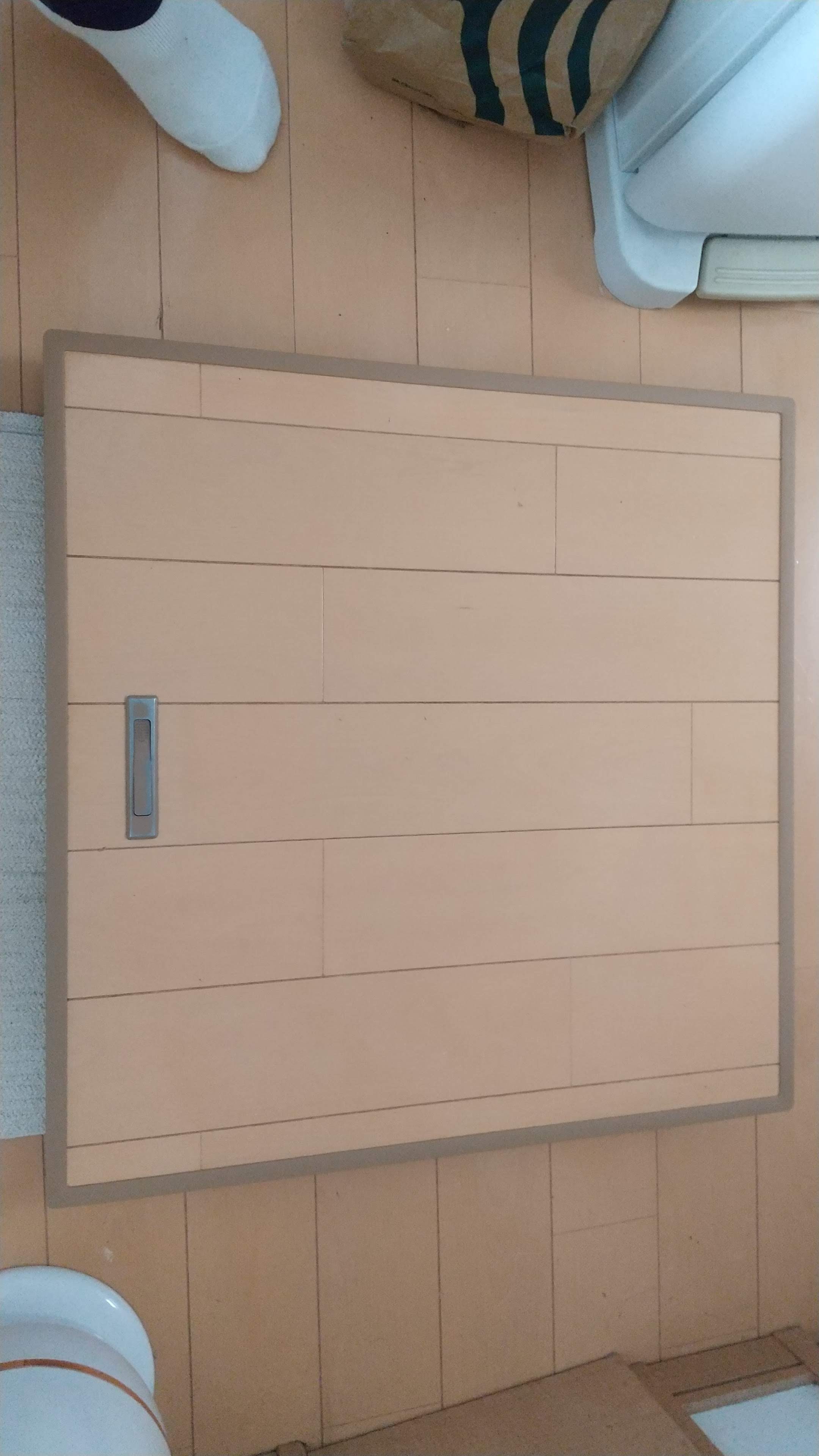 先日の電動シャッターの修理に続いて、今度は床下収納の修理を行いました。(一軒家に住むってこういうことなのね。)以前から少し凹むなあと気になっていて妻がボンドやテープで隙間を埋めていたのですが、数日前に私が踏み込んだところメリッといったのでさすがに修理することにしました。