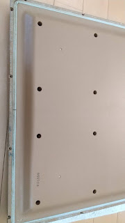 受枠と床の間に隙間が無いように注意するのに気づいたのは9本目のビスを留めているときでした。4辺のうち2辺はOKでしたが、残りの2辺は紙一枚入りそうな隙間があったので悩みましたが、たしか受枠の接着面にスポンジのような緩衝剤が入っていたので問題ないだろうということでそのまま続行しました。さすがにやり直すのは大変だしその効果も疑わしかったので今回は完璧を目指すのは辞めておきました。